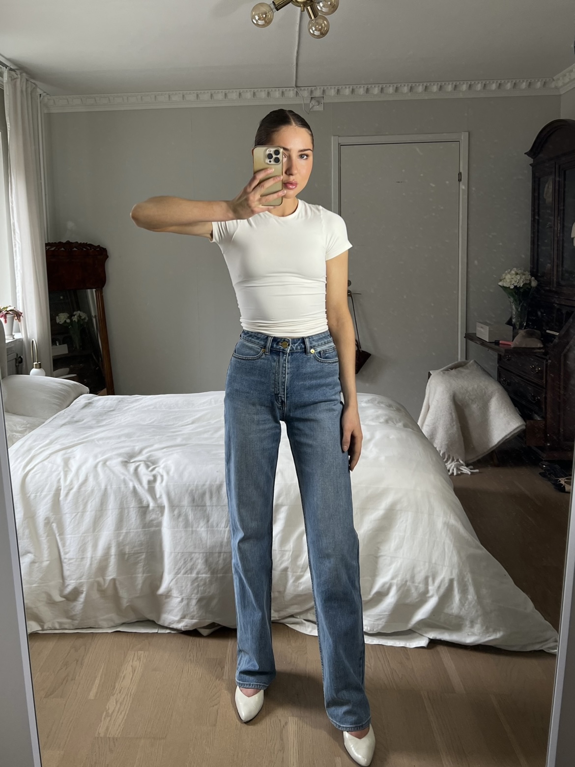 Låt oss börja med bastopparnas bastopp- den vita t-shirt:en. Mer klassiskt än så här blir det ju inte. Materialet är otroligt skönt mot huden och även om den sitter som ett andra lager skinn på kroppen så upplever jag inte att den sitter åt eller kväver mig på något sätt. Jag är en typisk storlek 34 i vanliga fall och valde därför att beställa denna i XS. Jag hade dock kunnat beställa en storlek större då sömmarna vittnar om att den är lite för snäv över axlarna på mig. Det förvånar mig dock inte då jag är som bredast över axelpartiet. Det svåra med tighta toppar som dessutom är ljusa brukar vara att de är för transparenta, detta problem upplevde jag inte med denna. Under bär jag en beige BH.