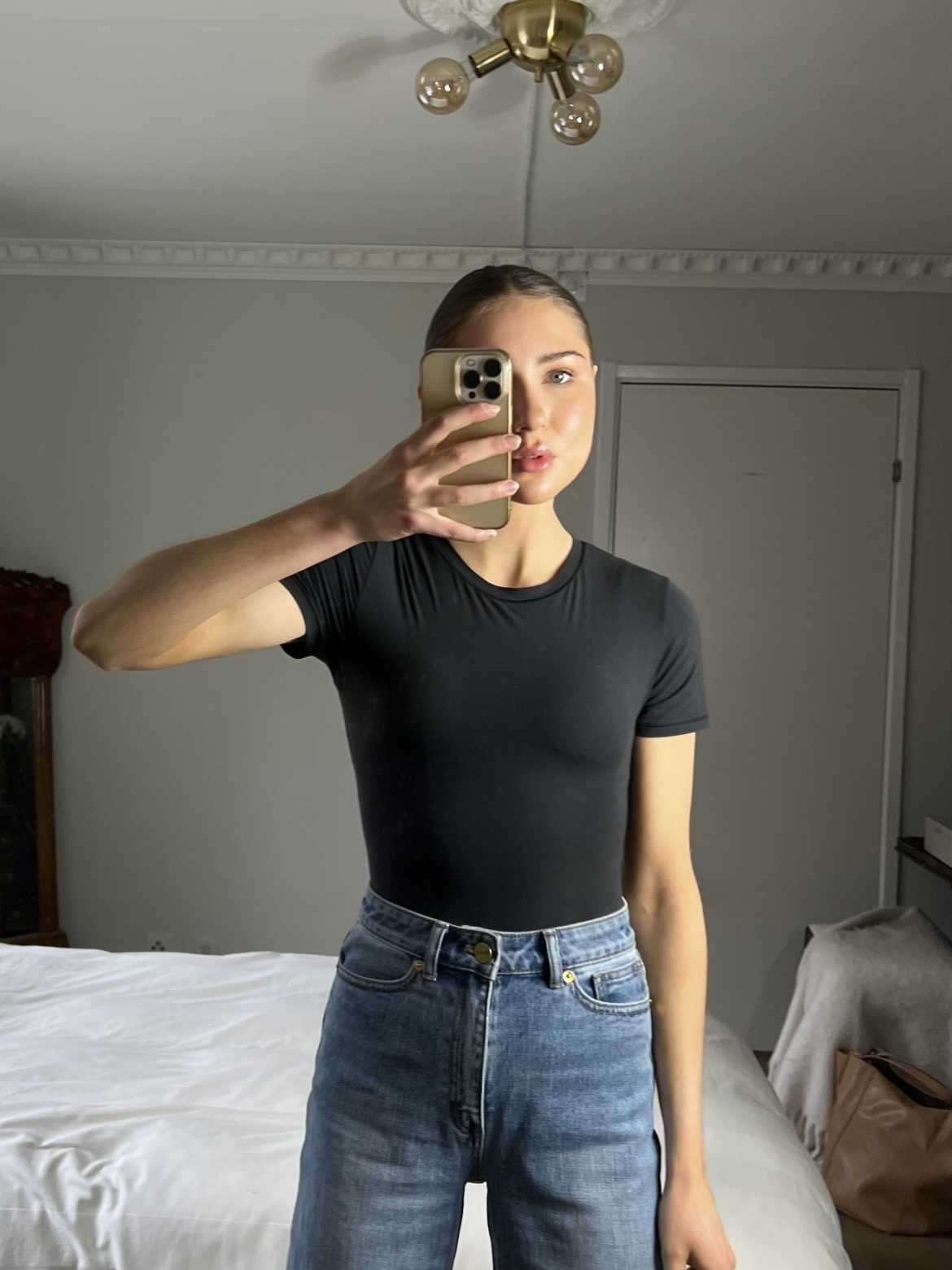 Sist och mest plågsam för plånboken har vi en kombination av de ovan- en t-shirt och bodysuit i ett. Denna är om möjligt ännu mjukare och mer elastisk än den vita t-shirten och jag älskar den! Även denna är mattsvart och således lite askigare i nyansen. Jag valde storlek S i denna också och ångrar inte mitt beslut. Den känns absolut inte för stor eller pösig utan smiter åt som den ska. Det enda negativa jag har att säga är att jag upplever att kragen veckar sig lite. Jag misstänker att det är ett resultat av knapparna i grenen som drar ner tyget och följaktligen får kragen att lägga sig lite konstigt. Bortsätt ifrån det älskar jag den!