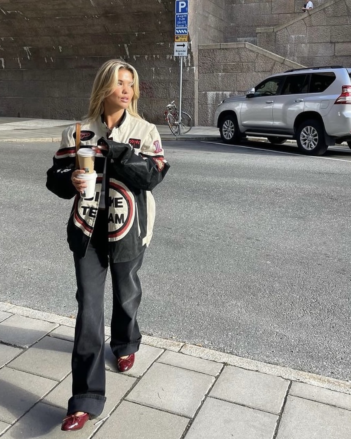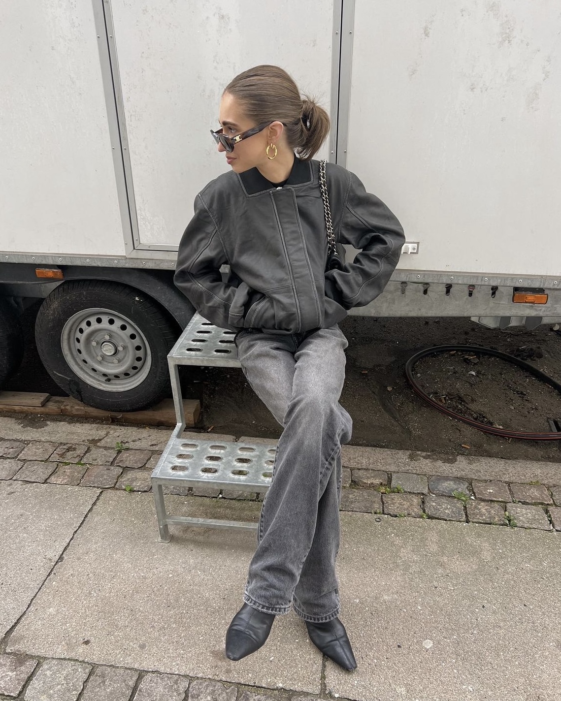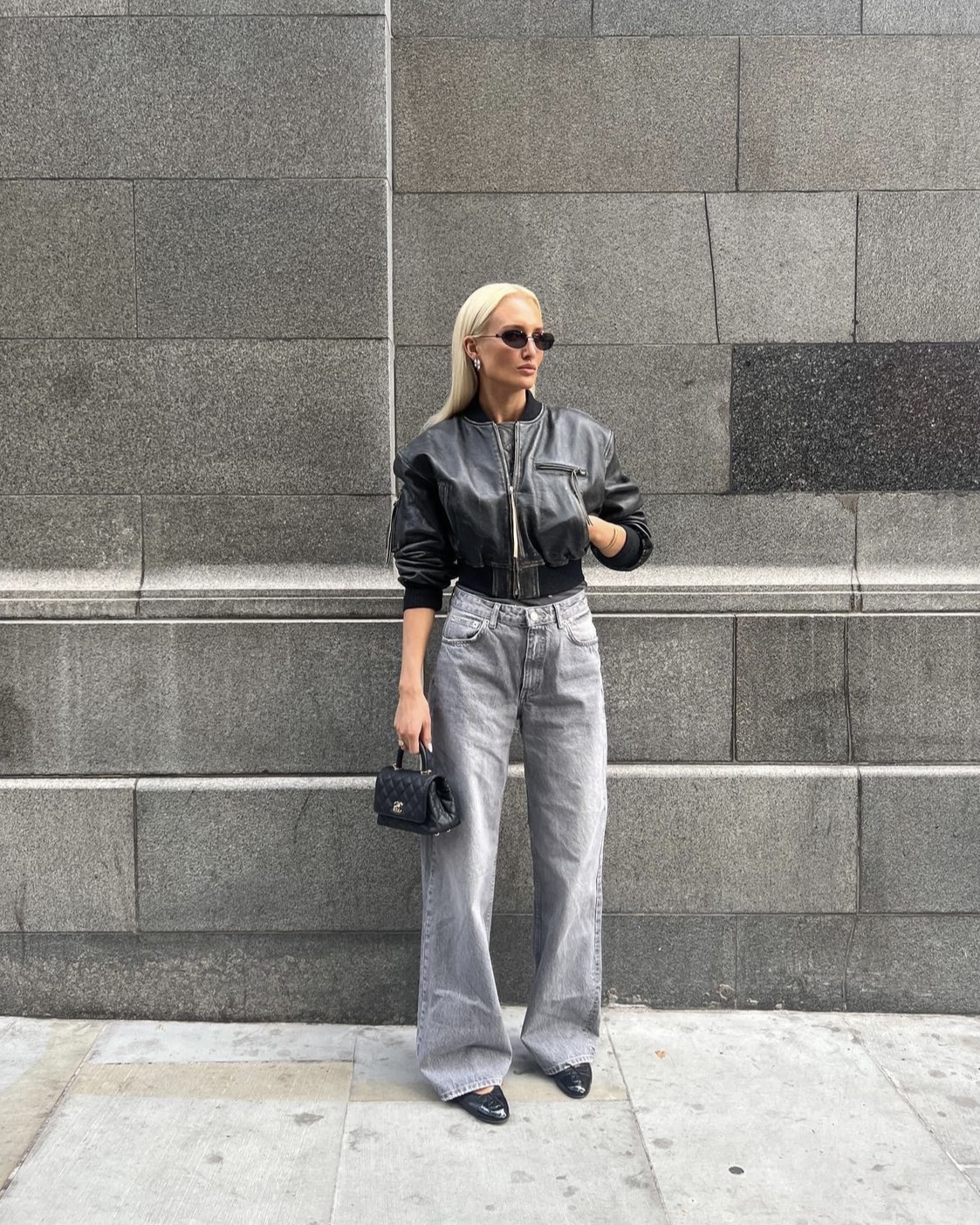 Precis som Matilda väljer stilikonen Lovisa Worge (@lovisaworge) att styla skinnjackan med ballerinaskor och top handle-väska. Dock satsar hon på mer monokrom look i gråskala med raka jeans i en ljusgrå tvätt och en mörkgrå, tajt tröja. Likaså otroligt snygg! Utöver det bär hon ett par solglasögon som blir pricken över i:et i denna trendsäkra outfit.