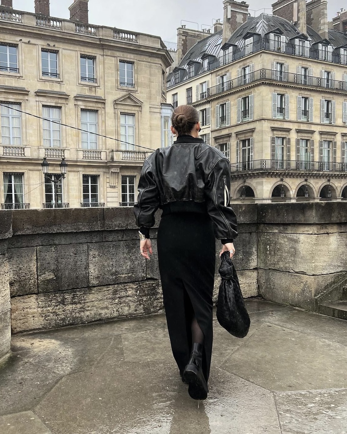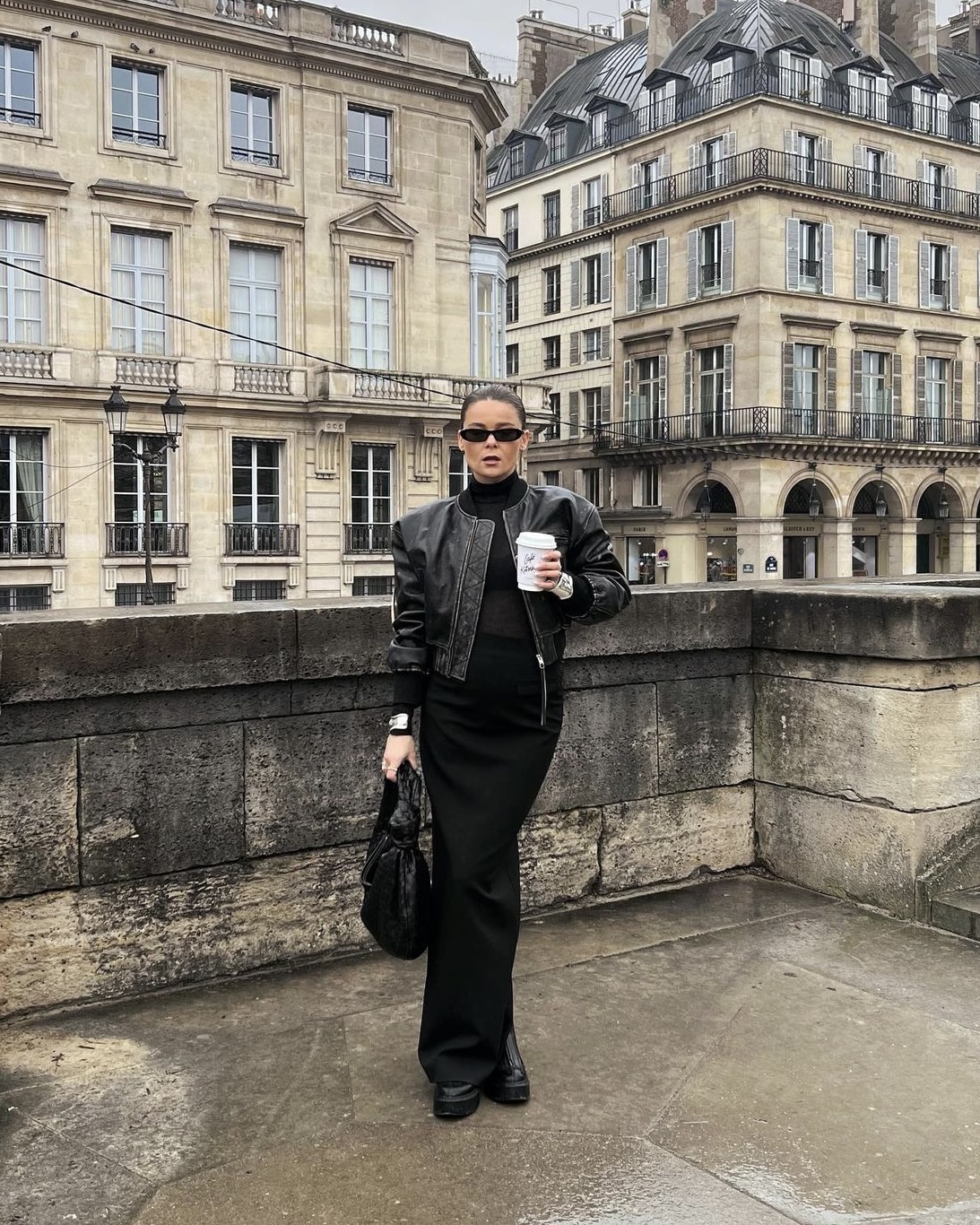 Blivande mamman och trendsättaren Rikke Krefting (@rikkekrefting) stylar jackan med figurnära maxi-kjol. Utöver det bär hon rejäla boots, en stram knut samt stor väska från Bottega Veneta. Resultatet blir en cool och stilsäker outfit.